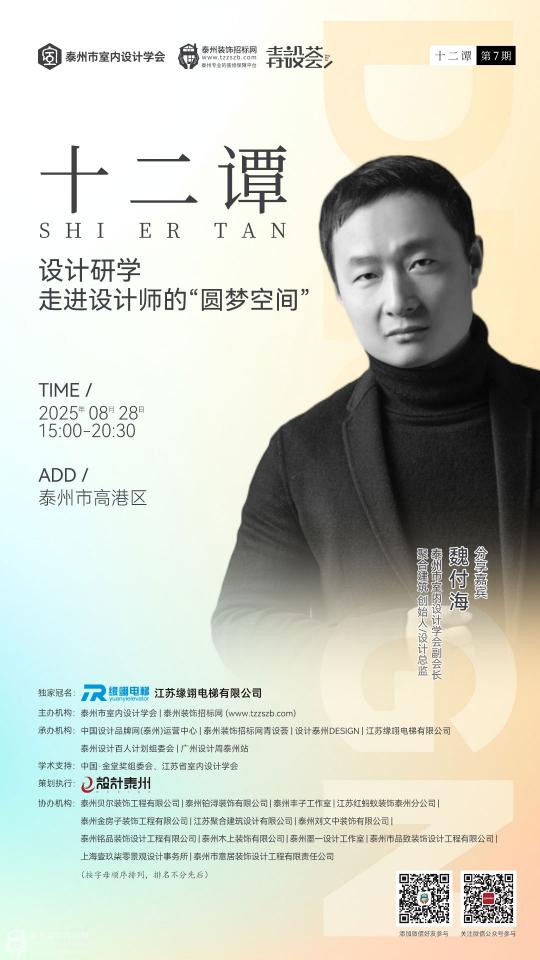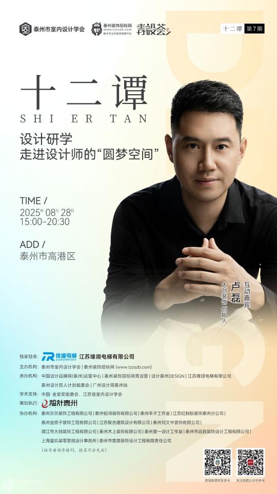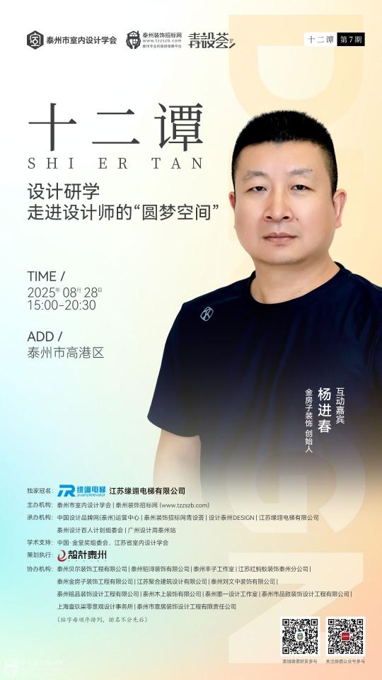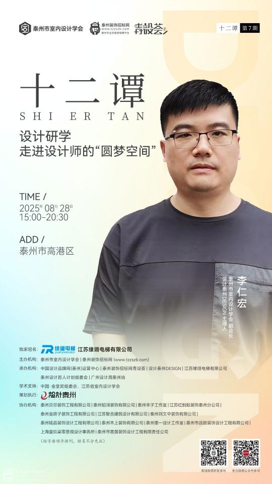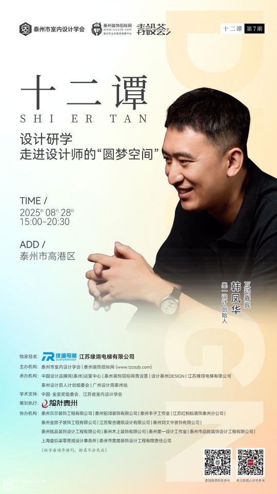 「十二譚」是由泰州市室內(nèi)設(shè)計(jì)學(xué)會(huì)、泰州裝飾招標(biāo)網(wǎng)青設(shè)薈、設(shè)計(jì)泰州Design聯(lián)合發(fā)起的設(shè)計(jì)師專屬研學(xué)平臺(tái),是以助推泰州最具潛力的室內(nèi)設(shè)計(jì)師提升發(fā)展為宗旨的設(shè)計(jì)賦能項(xiàng)目,通過(guò)整合資源、走動(dòng)式學(xué)習(xí)、沉浸式互動(dòng),促進(jìn)泰州青年設(shè)計(jì)師成長(zhǎng)。