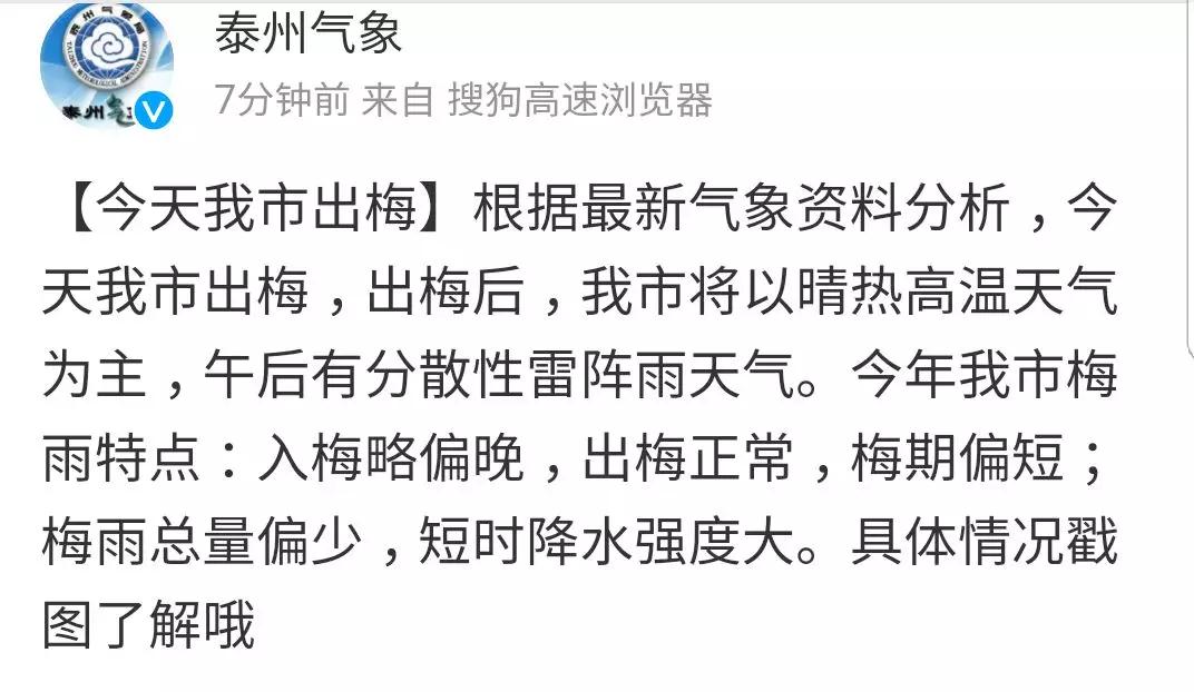 裝修有保障【導讀】今天下午 市氣象局正式宣布 泰州出梅了 泰州出梅了 泰州出梅了 終于不再 濕噠噠 黏糊糊 潮膩膩啦! 看下梅姑娘的小結(jié) ↓↓↓ @泰州氣象下午14點46分發(fā)布:7月9日我市出梅。今年入梅略偏晚,出梅正常,梅期偏短;梅雨總量偏 ...