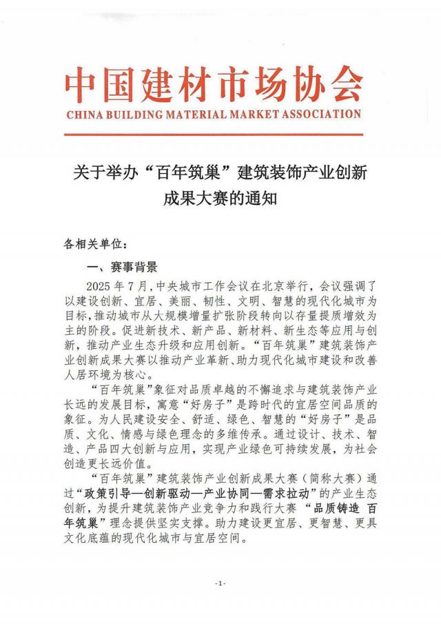關(guān)于舉辦“百年筑巢”建筑裝飾產(chǎn)業(yè)創(chuàng)新成果大賽的通知